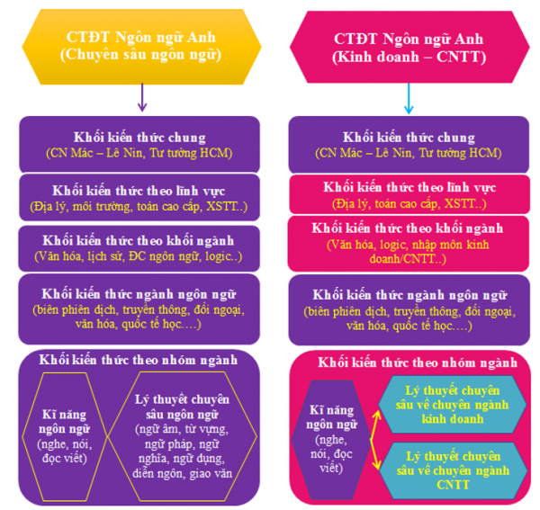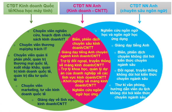The Bachelor of English language program at VNU International school does not focus solely on language acquisition but rather on specialized fields similar to other English language programs (such as those at Hanoi University of Foreign Trade, University of Commerce, Ho Chi Minh City University of Economics, Vietnam Maritime University, Hanoi University of Science and Technology, and FPT University). Therefore, VNU International School aims to replace the in-depth language knowledge such as functional grammar, semantics, pragmatics, discourse analysis, etc… with specialized knowledge in either business or IT fields. Graduates of the Bachelor of English language program at VNU International School will be positioned in the intersection of the two circles in the diagram below: