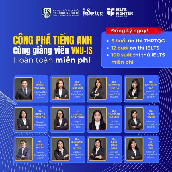 Trường Quốc tế – Đại học Quốc gia Hà Nội (ĐHQGHN) tổ chức chương trình “Công phá tiếng Anh THPT” nhằm hỗ trợ các bạn học sinh lớp 12 ôn tập cho kỳ thi tốt nghiệp THPT năm 2025 và luyện thi IELTS, tạo nền tảng vững chắc cho việc học tiếng Anh trong môi trường quốc tế. Đây là cơ hội tuyệt vời giúp các bạn học sinh không chỉ nâng cao kỹ năng tiếng Anh mà còn tự tin hơn khi đối diện với các kỳ thi quan trọng sắp tới.