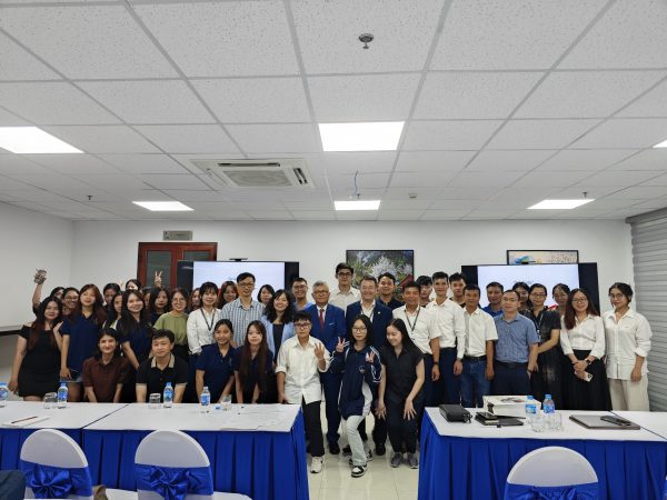 Diễn giả chụp ảnh lưu niệm cùng cán bộ, giảng viên, sinh viên Trường Quốc tế.
