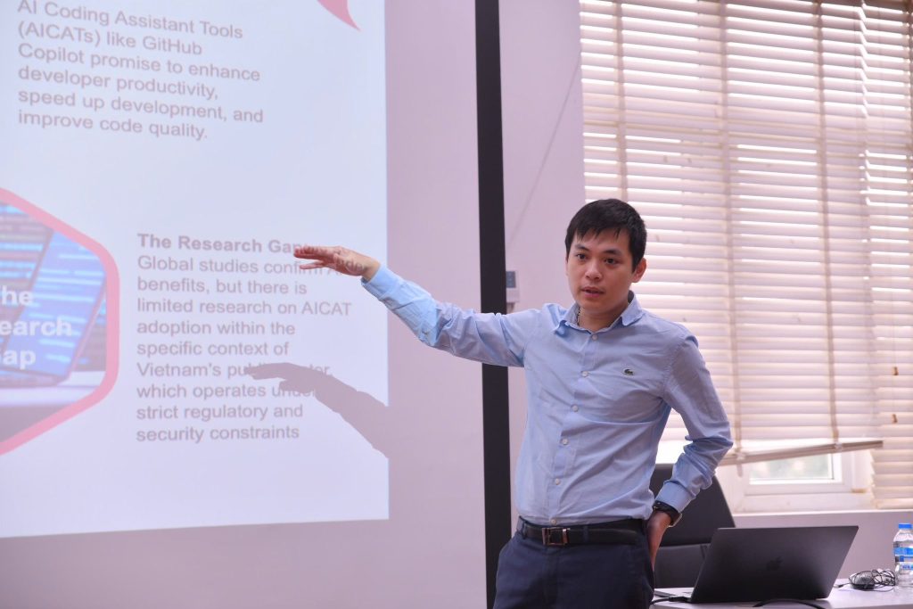 Phần trình bày của học viên Fintech gây ấn tượng với hội đồng nhờ cách lập luận rõ ràng, tự tin và khả năng diễn đạt hoàn toàn bằng tiếng Anh.