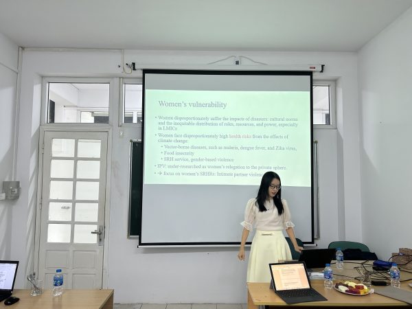 Tiếp nối chương trình, diễn giả Nguyễn Trà My chia sẻ về chủ đề “How climate change affects intimate partner violence: evidence from LMICs”. Tác giả chỉ ra đối tượng chính của bài nghiên cứu về vấn đề sức khỏe của phụ nữ ở các đất nước LMI dễ dàng bị ảnh hưởng bởi sự thay đổi thời tiết. Bài nghiên cứu đặt ra sự thiếu hụt quan tâm đến các vấn đề về sức khỏe tâm lý và vật lý của phụ nữ thông qua IPV. Rủi ro về nguồn lương thực cộng thêm với các quan niệm phân biệt giới tính ảnh hưởng đến nhận thức và dẫn đến rủi ro của các hành vi bạo lực từ đàn ông lên phụ nữ tại các đất nước này, những người dễ bị tổn thương trong điều kiện trên. Cuối cùng, bài nghiên cứu đưa ra một số gợi ý cho chính phủ đưa ra một số chính sách, khuyến khích cộng đồng quan tâm hơn đến phụ nữ.