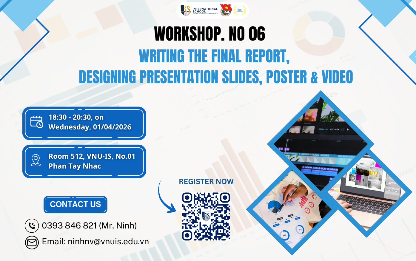 Trường Quốc tế – Đại học Quốc gia Hà Nội tổ chức workshop số 06 với chủ đề: “Hướng dẫn xây dựng báo cáo tổng kết, thiết kế slide thuyết trình, poster và videoclip nghiên cứu khoa học”. Workshop được thiết kế như một “cẩm nang thực chiến”, giúp sinh viên: ✦Hệ thống hóa toàn […]