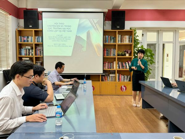 PGS.TS. Nguyễn Phương Mai mở đầu với bài trình bày về đo lường mức độ trưởng thành số tại các trường đại học. Diễn giả nhấn mạnh rằng chuyển đổi số là một yêu cầu tất yếu trong bối cảnh toàn cầu hóa và cách mạng công nghiệp 4.0, đồng thời giới thiệu các tiêu chí cụ thể giúp các trường xác định và xây dựng chiến lược phát triển phù hợp. Bên cạnh đó, PGS.TS. Nguyễn Phương Mai chia sẻ các châm ngôn nổi tiếng về sự cân bằng giữa công việc và cuộc sống, khẳng định vai trò của công nghệ trong việc hỗ trợ giáo dục bền vững, không chỉ nâng cao chất lượng học thuật mà còn cải thiện đời sống cá nhân.