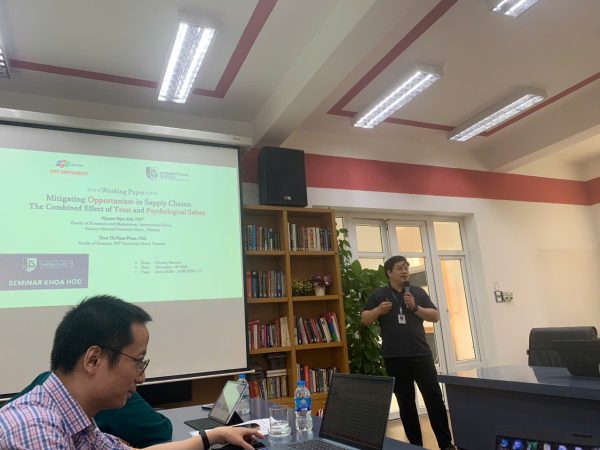 Trong phần cuối của hội thảo, TS. Nguyễn Ngọc Anh trình bày nghiên cứu về hành vi cơ hội trong chuỗi cung ứng, tập trung vào mối quan hệ giữa niềm tin, an toàn tâm lý và các hành vi cơ hội trong hợp tác. Nghiên cứu chỉ ra rằng khi lòng tin bị suy giảm, các hành vi tiêu cực như gian lận và gián đoạn giao tiếp có xu hướng gia tăng, dẫn đến tổn hại uy tín thương hiệu. Thông qua mô hình Opportunism, Psychological Safety và Trust, diễn giả phát hiện ra việc tăng cường an toàn tâm lý không chỉ giảm thiểu hành vi cơ hội mà còn cải thiện hiệu quả hợp tác trong chuỗi cung ứng. Nghiên cứu này không chỉ đóng góp vào lĩnh vực lý thuyết mà còn đưa ra các khuyến nghị thực tiễn nhằm nâng cao hiệu quả quản lý trong bối cảnh chuyển đổi số.