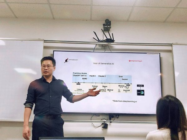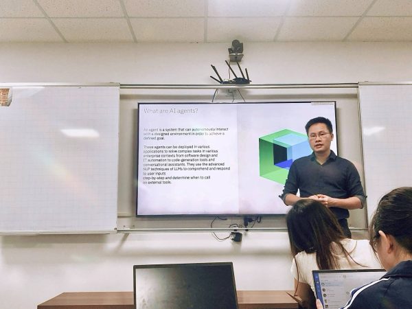 Nhằm giúp sinh viên tiếp cận được với những xu hướng mới nhất trong lĩnh vực Trí tuệ Nhân tạo, ngày 29/4/2025 vừa qua, sinh viên Trường Quốc tế – Đại học Quốc gia Hà Nội (ĐHQGHN) đã có buổi học với anh Dương Quang Đức – chuyên gia giàu kinh nghiệm, hiện đang làm kiến trúc sư tư vấn và triển khai nền tảng Data & AI tại IBM Việt Nam.