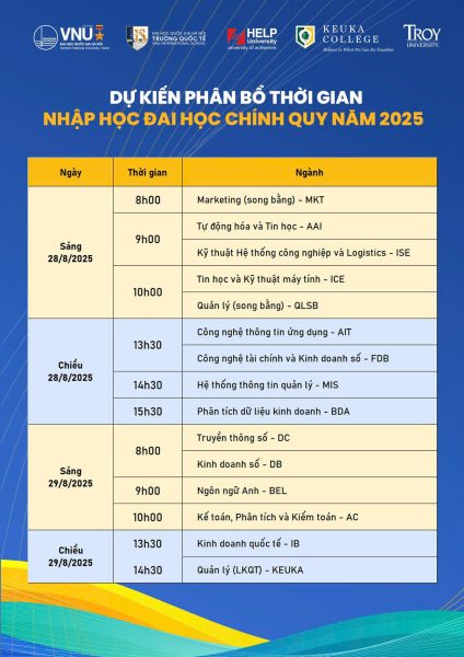 Trong hai ngày 28 – 29/8/2025, Trường Quốc tế – Đại học Quốc gia Hà Nội (ĐHQGHN) sẽ mở cửa chào đón các tân sinh viên K24 đến làm thủ tục nhập học tại 144 Xuân Thủy, Cầu Giấy, Hà Nội.