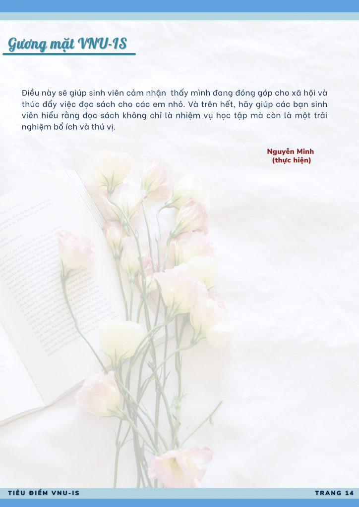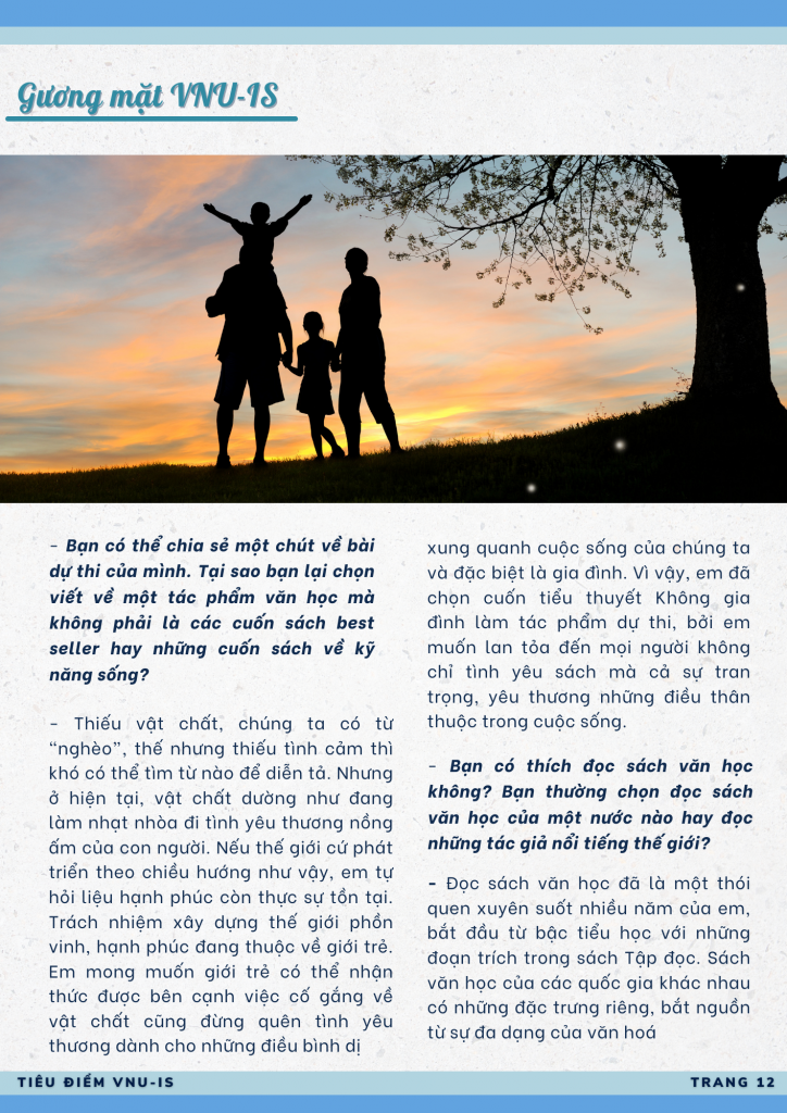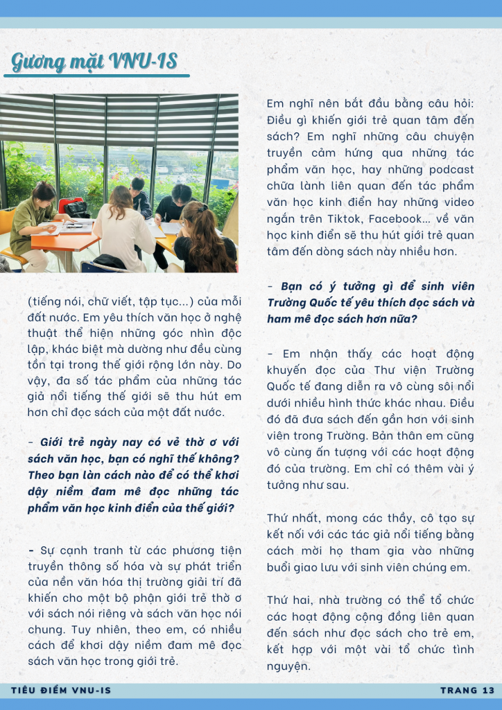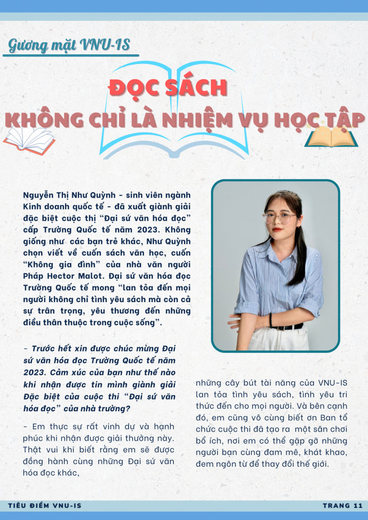 Nguyễn Thị Như Quỳnh – sinh viên ngành Kinh doanh quốc tế – đã xuất giành giải đặc biệt cuộc thị “Đại sứ văn hóa đọc” cấp Trường Quốc tế năm 2023. Không giống như các bạn trẻ khác, Như Quỳnh chọn viết về cuốn sách văn học, cuốn “Không gia đình” của nhà văn người Pháp Hector Malot. Đại sứ văn hóa đọc Trường Quốc tế mong “lan tỏa đến mọi người không chỉ tình yêu sách mà còn cả sự trân trọng, yêu thương đến những điều thân thuộc trong cuộc sống”.