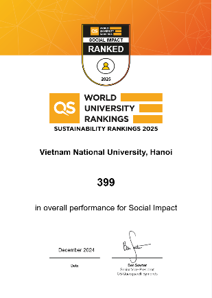 Ngày 10/12/2024, tổ chức xếp hạng QS đã công bố kết quả xếp hạng QS World University Rankings: Sustainability 2025 cho 1.751 cơ sở giáo dục đại học trên toàn thế giới. Trong kỳ xếp hạng lần này, ĐHQGHN đã có sự thăng tiến mạnh về vị trí khi được xếp hạng 325 thế giới (gia tăng 456 bậc so với vị trí xếp hạng trong top 781-790 tại kỳ xếp hạng QS World University Rankings: Sustainability 2024), vị trí 51 của khu vực châu Á và số 1 Việt Nam. Kết quả được công bố đúng vào ngày thành lập của ĐHQGHN 10/12/1993-10/12/2024.