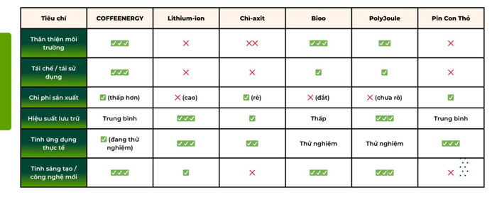 Bảng so sánh về một số tiêu chí giữa pin Coffeenergy và một số loại pin khác. Ảnh: NVCC.