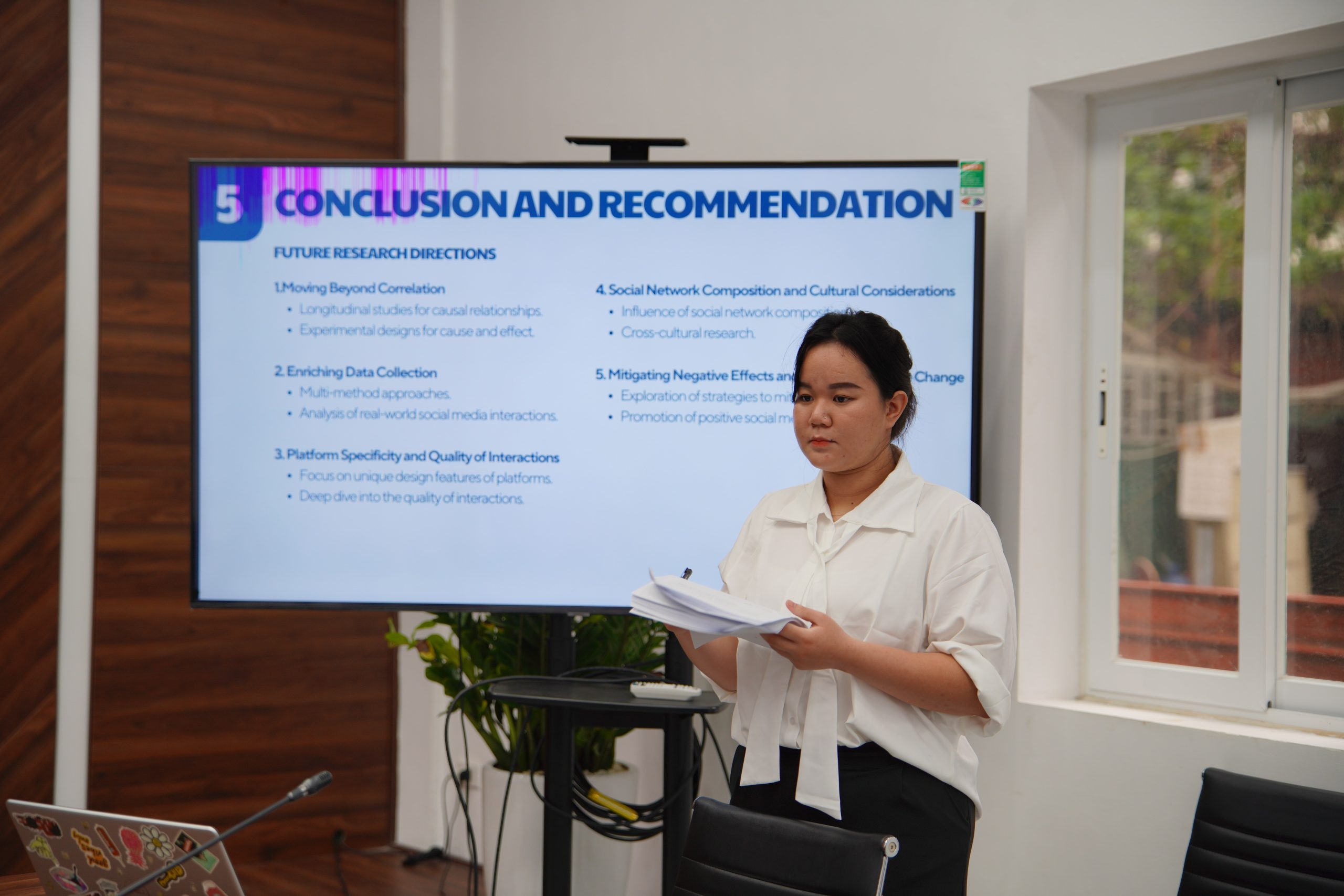 The thesis topics were diverse and reflected the educational philosophy of the respective disciplines. The research focused on studying online shopping trends, particularly among young people on various online platforms, the challenges in marketing of low-cost airlines in Vietnam, experimental research on the intention to use public transportation in Hanoi, and more. The committee meetings were lively, with students presenting their reports and then listening to feedback and suggestions from Dr. Sumathi Paramasivam and the faculty members from the Faculty of Economics and Business Administration. After today’s defense sessions, the students will make revisions and improvements based on the recommendations of the professors before submitting the final version to the university.