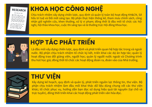 Tham mưu, giúp việc Hiệu trưởng trong quản lý hoạt động khoa học và công nghệ (KH&CN), đổi mới sáng tạo (ĐMST); hoạt động hợp tác và phát triển (HT&PT) trong và ngoài nước; trao đổi và thu hút cán bộ, giảng viên và người học quốc tế và hoạt động thư viện.