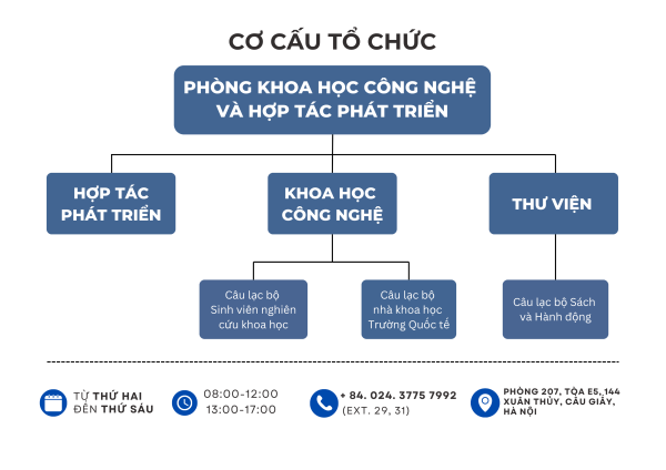 | 1. GIỚI THIỆU SƠ LƯỢC VỀ PHÒNG Phòng Khoa học công nghệ và Hợp tác phát triển (KHCN&HTPT) là đơn vị trực thuộc Trường Quốc tế – Đại học Quốc gia Hà Nội. Phòng KHCN&HTPT được đổi tên và điều chỉnh chức năng nhiệm vụ từ năm 2016 với mục đích tham mựu, giúp cho Ban Giám hiệu trong các công tác về hoạt động Khoa học công nghệ, Hợp tác phát triển, Truyền thông và Quản trị thương hiệu và Thông tin thư viện. 2. LIÊN HỆ: Trường Quốc tế – ĐHQGHN, Nhà E5, 144 Xuân Thủy, Cầu Giấy, Hà Nội 3. DANH SÁCH CÁN BỘ