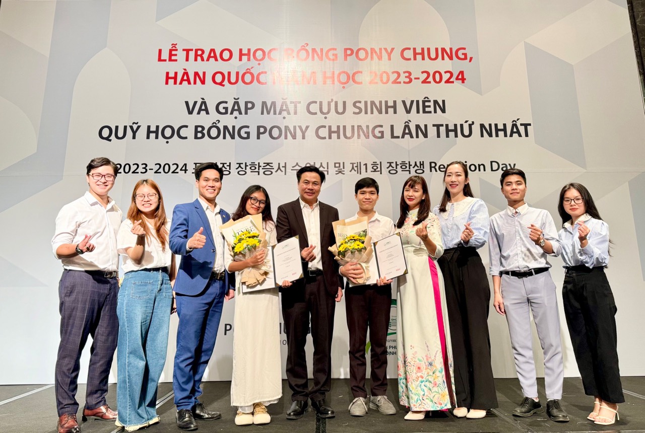 Trần Lam Sơn, sinh viên ngành Kinh doanh quốc tế, và Vũ Hồng Hạnh, sinh viên ngành Kế toán, Phân tích và Kiểm toán, Trường Quốc tế – Đại học Quốc gia Hà Nội (ĐHQGHN) vinh dự nhận học bổng Pony Chung, Hàn Quốc, trị giá 6.00 USD, tương đương 15 triệu VNĐ. Ngày 06/11/2023, tại Khách sạn Marriott đã diễn ra Lễ trao học bổng Pony Chung năm học 2023-2024 cho 35 sinh viên xuất sắc thuộc các đơn vị đào tạo của ĐHQGHN và gặp mặt cựu sinh viên Quỹ học bổng Pony Chung lần thứ Nhất.