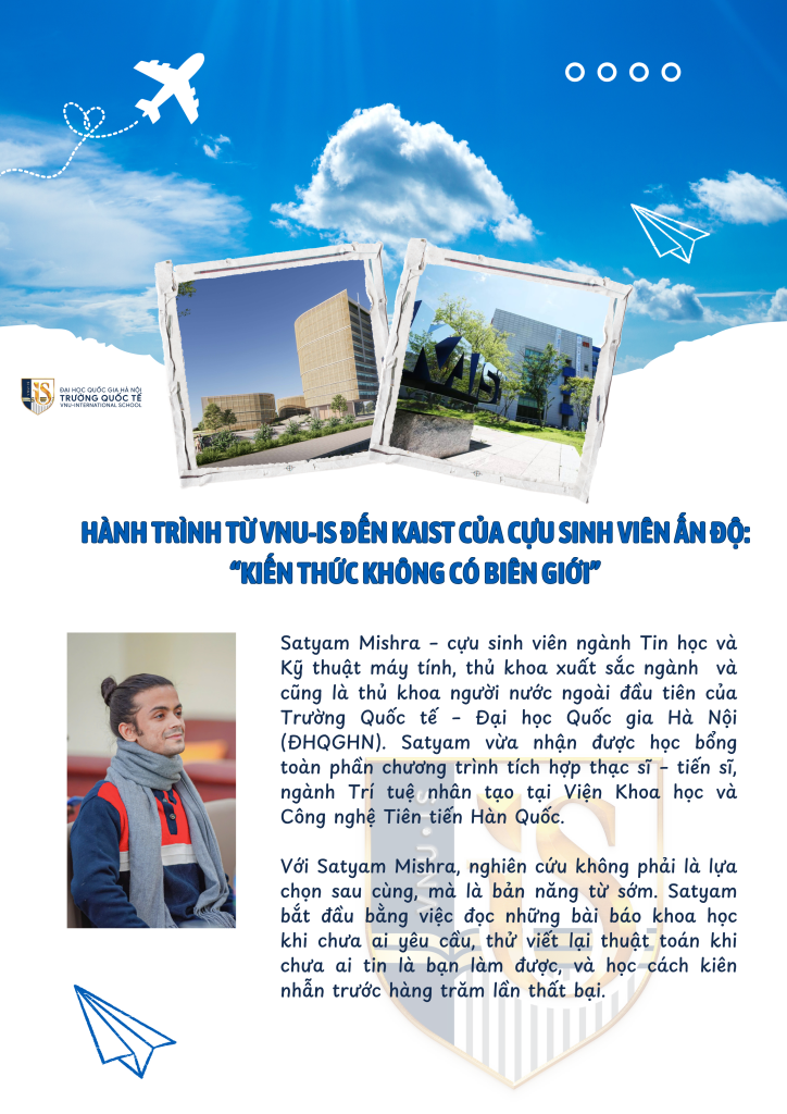 Satyam Mishra – cựu sinh viên ngành Tin học và Kỹ thuật máy tính, thủ khoa xuất sắc ngành và cũng là thủ khoa người nước ngoài đầu tiên của Trường Quốc tế – Đại học Quốc gia Hà Nội (ĐHQGHN). Satyam vừa nhận được học bổng toàn phần chương trình tích hợp thạc sĩ – tiến sĩ, ngành Trí tuệ nhân tạo tại Viện Khoa học và Công nghệ Tiên tiến Hàn Quốc.