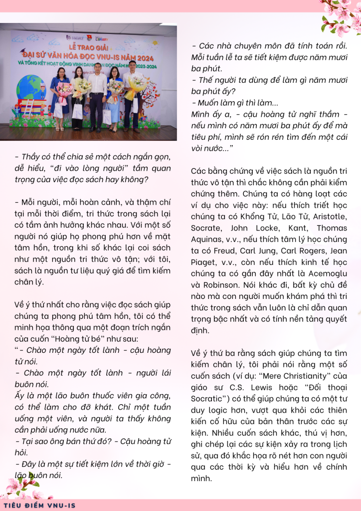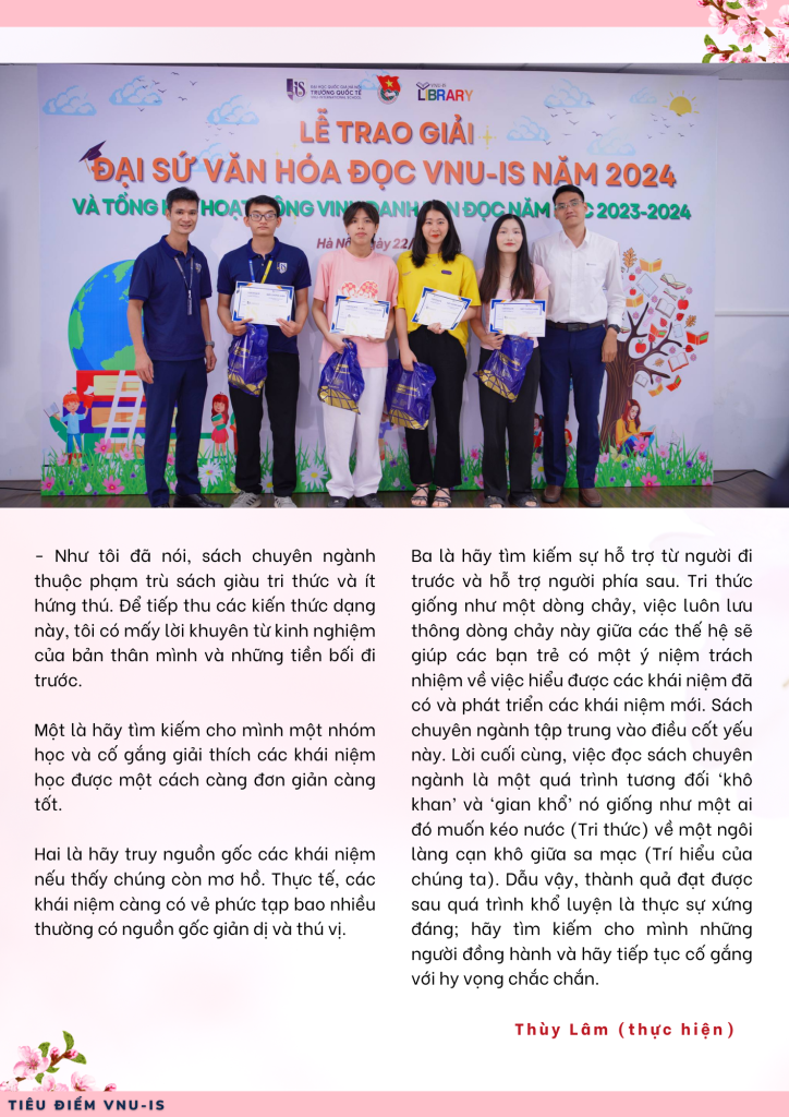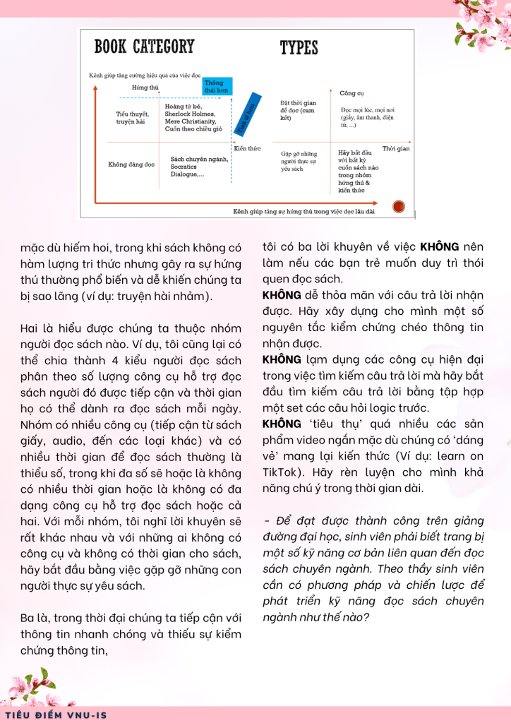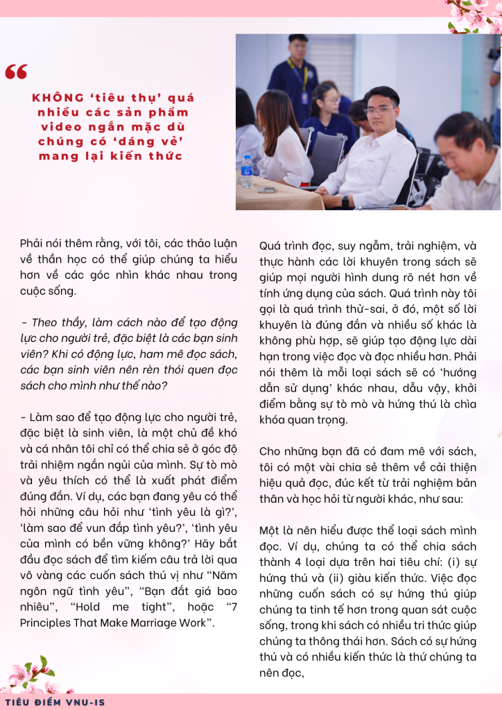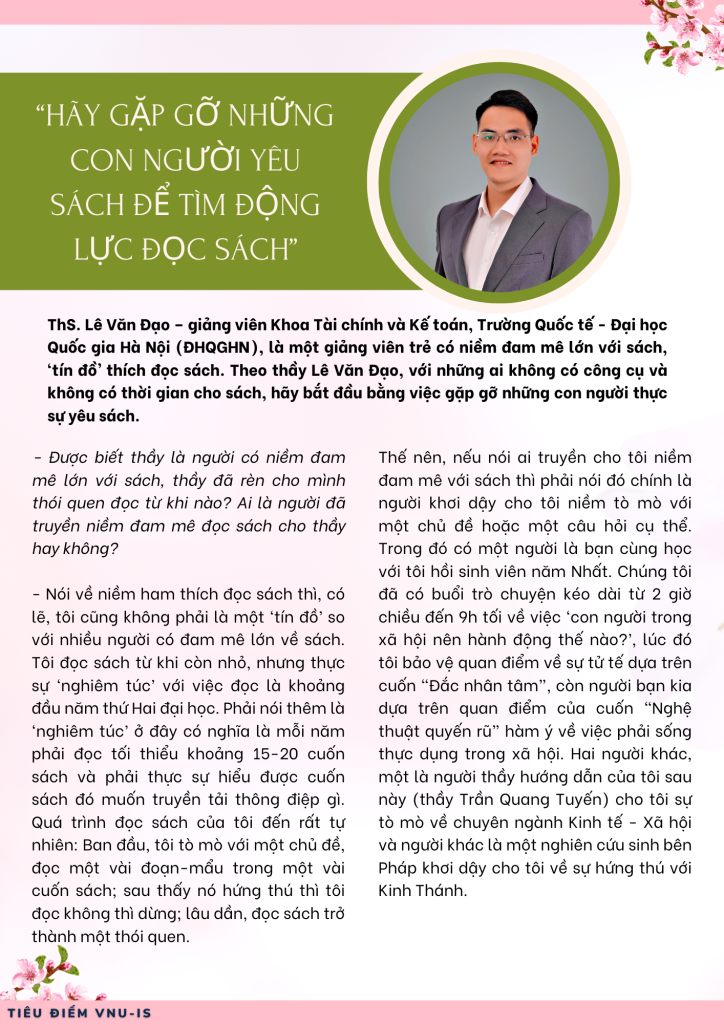 ThS. Lê Văn Đạo – giảng viên Khoa Tài chính và Kế toán, Trường Quốc tế – Đại học Quốc gia Hà Nội (ĐHQGHN), là một giảng viên trẻ có niềm đam mê lớn với sách, ‘tín đồ’ thích đọc sách. Theo thầy Lê Văn Đạo, với những ai không có công cụ và không có thời gian cho sách, hãy bắt đầu bằng việc gặp gỡ những con người thực sự yêu sách.