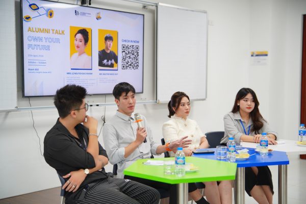 Diễn giả Lê Nguyễn Bảo Khánh – nguyên trợ lý Chủ tịch Tập đoàn Vingroup, Chủ tịch UQ Alumni Network tại Hà Nội và diễn giả Nguyễn Ngọc Huy – Senior IT Business Analyst tại TaylorMade Golf US + CA + 6 YOE tại workshop “Alumni Talk: Own Your Future”.