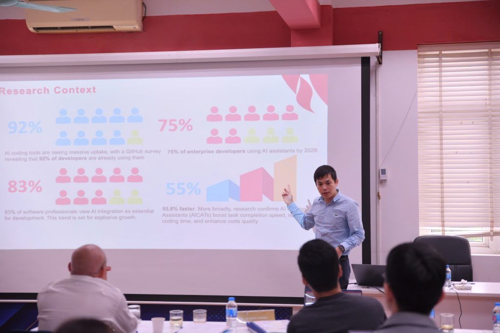 – Thực ra, đề tài này đến với tôi khá tự nhiên, vì nó gắn trực tiếp với công việc tôi đang làm tại doanh nghiệp. Trong lĩnh vực fintech, công nghệ được xem là năng lực cạnh tranh cốt lõi, và trách nhiệm của đội ngũ công nghệ là không ngừng nâng cao năng suất, rút ngắn thời gian triển khai, thử nghiệm liên tục và đưa sản phẩm ra thị trường nhanh hơn, đồng thời vẫn đảm bảo chất lượng vận hành của hệ thống. Sự xuất hiện của AI đã tạo ra một bước chuyển rõ rệt trong cách các tổ chức tiếp cận công nghệ, từ vai trò hỗ trợ xử lý nhiệm vụ sang tham gia sâu hơn vào quản lý quy trình, hỗ trợ ra quyết định và phối hợp giữa con người với hệ thống. Ở cấp độ doanh nghiệp lớn, nếu được triển khai hiệu quả, AI có thể trở thành một lợi thế cạnh tranh quan trọng trong bối cảnh thị trường biến động nhanh và nguồn nhân lực công nghệ ngày càng hạn chế.