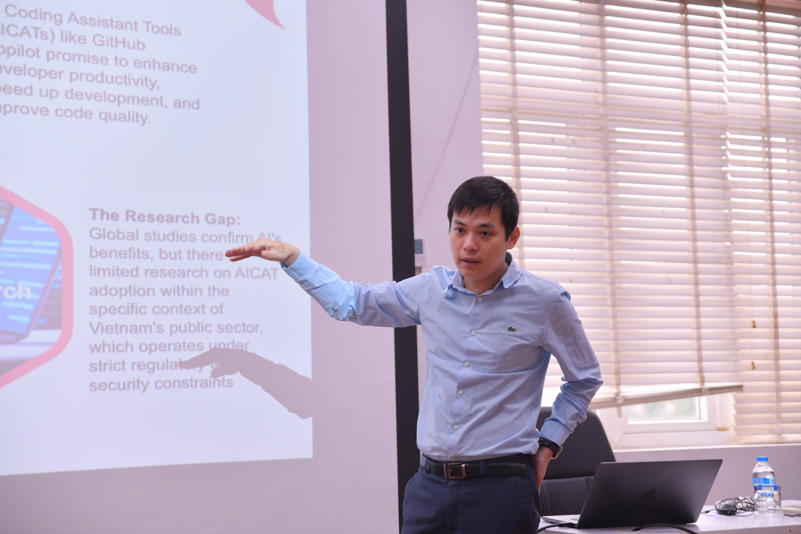 Anh Quân và đề tài bảo vệ “Evaluation of factors influencing the adoption of AI coding assistant tools (AICATS) among developers in a state-owned fintech company in Vietnam” tại hội đồng bảo vệ Thạc sĩ FINTECH ngày 6/12/2025.