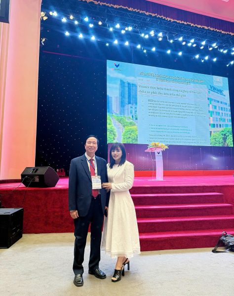 Học viên Trần Thị Ánh chụp ảnh lưu niệm cùng GS.TS.BS. Nguyễn Thanh Liêm – Viện trưởng Viện nghiên cứu Tế bào gốc và Công nghệ gen Vinmec, Viện Khoa học Sức khỏe, Trường Đại học VinUni.