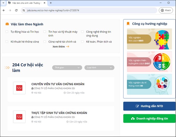 Bước 1: Trên trang https://job.isvnu.vn/co-hoi-nghe-nghiep hiển thị việc làm của các doanh nghiệp đang tuyển dụng