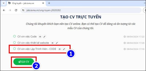 Bước 3: Chọn CV xin việc mà bạn đã tạo trước đó, nhấn Gửi CV.