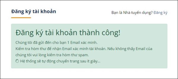 – Bạn đăng nhập vào email đăng ký tài khoản ứng viên đã nhập ở trên, tiếp tục mở email xác minh tài khoản “Thông tin xác minh tài khoản” và làm theo hướng dẫn trong email.