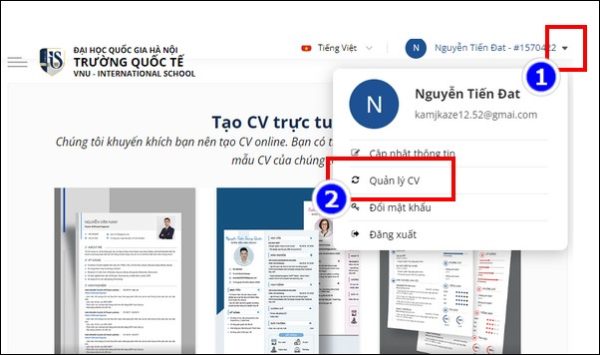 Bước 1: Tại giao diện chính trên trang, bạn nhấn biểu tượng mũi tên cạnh tài khoản và vào mục Quản lý CV.