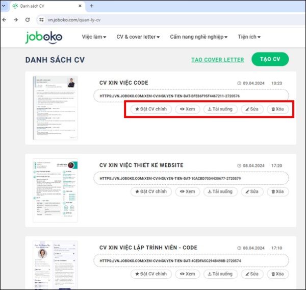 3. Cách quản lý CV đã tạo – xem, sửa, xóa, tải