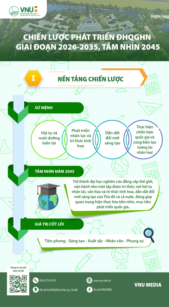 Đại học Quốc gia Hà Nội xác định nền tảng chiến lược phát triển giai đoạn 2026–2035, tầm nhìn 2045 dựa trên sứ mệnh hội tụ và nuôi dưỡng hiền tài, phát triển tri thức tinh hoa và dẫn dắt đổi mới sáng tạo.
