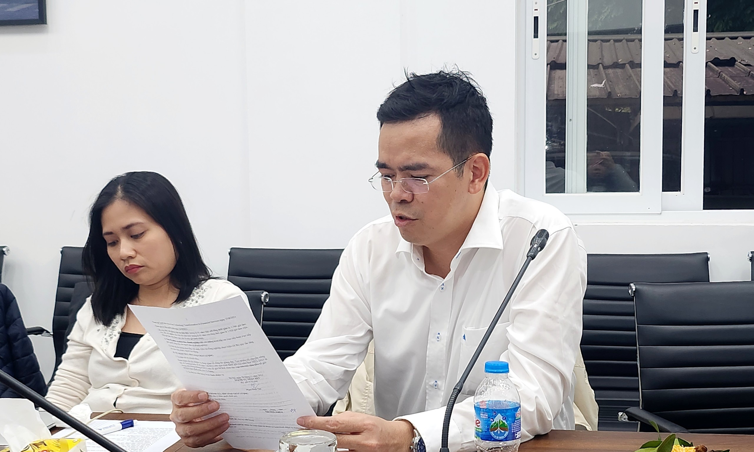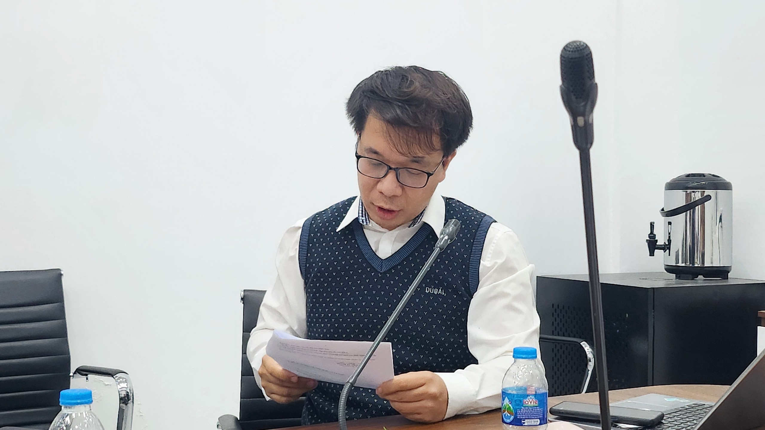 TS. Chu Đình Tới đọc bản dự thảo báo cáo Tình hình thực hiện các nhiệm vụ, hoạt động trọng tâm năm 2023 của Khoa và Đăng kí các chỉ tiêu nhiệm vụ chiến lược năm 2024
