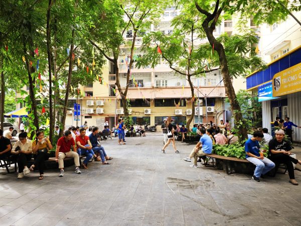Phụ huynh đến sớm cùng con và ngồi chờ các con ngoài phòng thi.