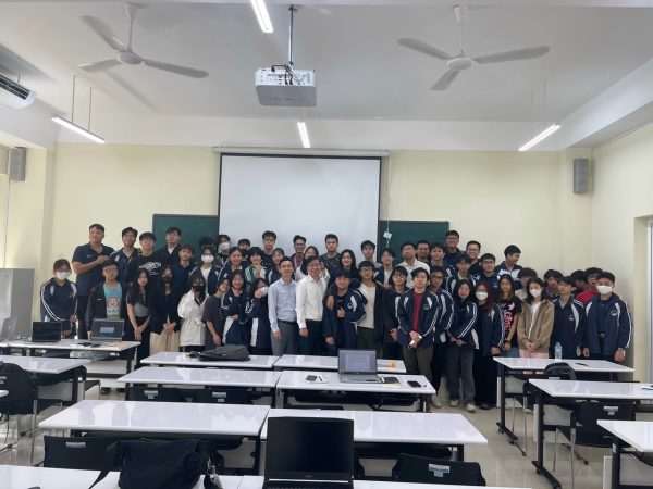 Diễn giả chụp ảnh lưu niệm cùng giảng viên và sinh viên Trường Quốc tế.