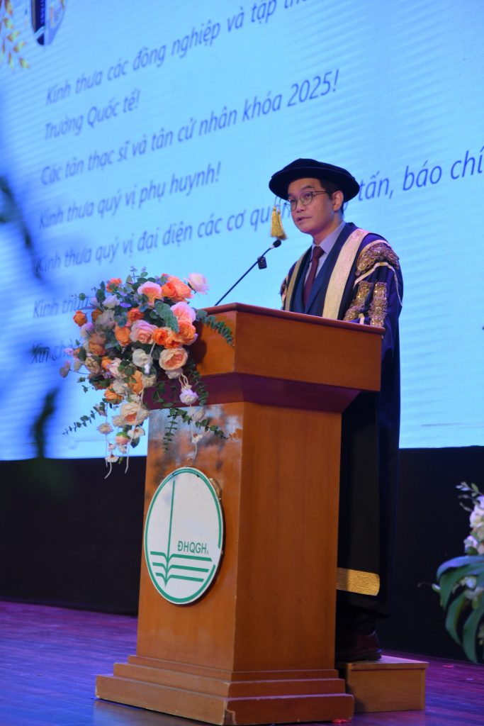 Phát biểu khai mạc, PGS.TS Đào Thanh Trường – Phó Giám đốc ĐHQGHN, Phụ trách Trường Quốc tế, cho biết: Sau 30 năm xây dựng và phát triển, ĐHQGHN duy trì vị trí số 1 tại Việt Nam và nằm trong nhóm 801–1000 trường đại học hàng đầu thế giới (THE, QS). Trong bức tranh ấy, Trường Quốc tế giữ vai trò trung tâm kết nối quốc tế (hub), triển khai các chương trình đồng cấp bằng, đồng kiểm định, đồng nghiên cứu, khẳng định uy tín trong đào tạo và nghiên cứu.