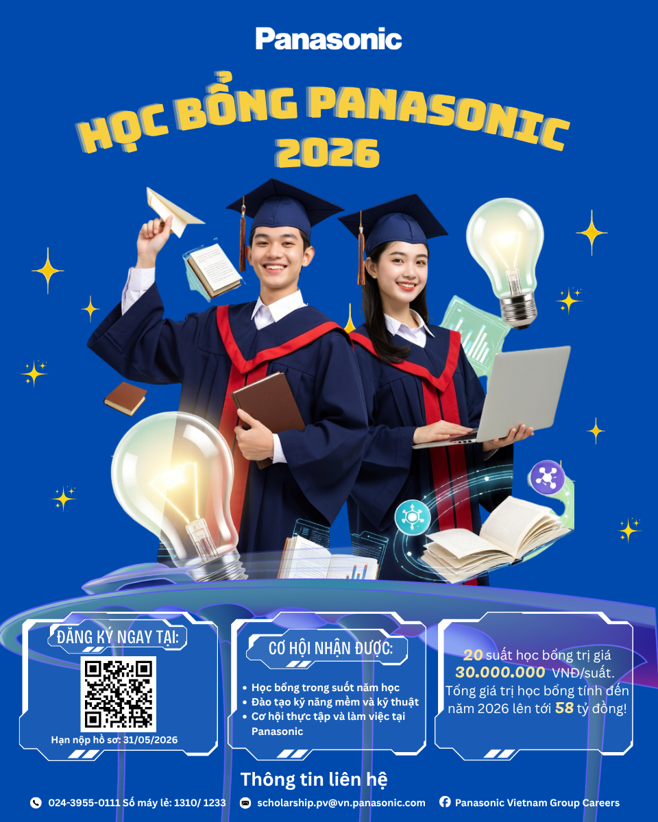 Nhằm hỗ trợ sinh viên Việt Nam phát triển toàn diện về học tập, kỹ năng và định hướng nghề nghiệp, chương trình Học bổng Panasonic 2026 chính thức mở cổng đăng ký từ ngày 01/4/2026.