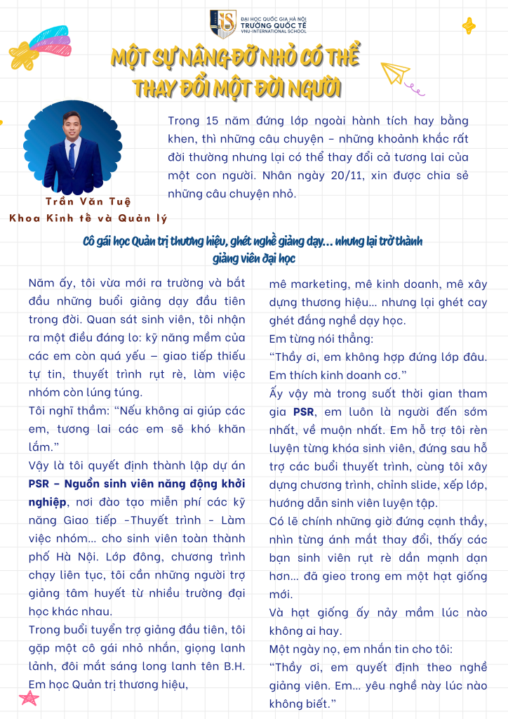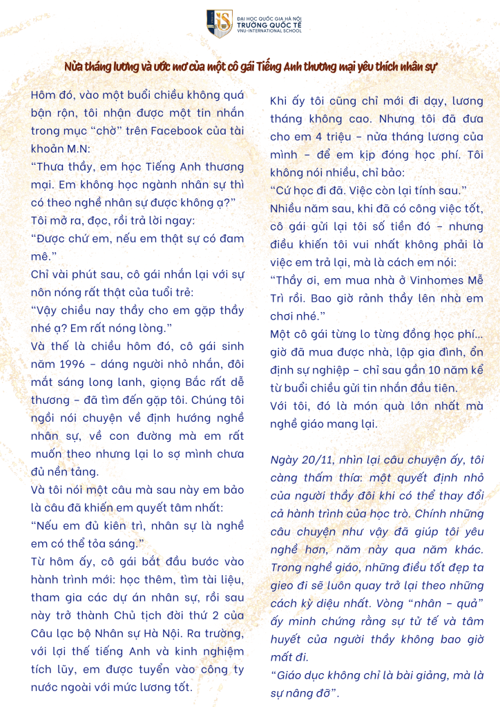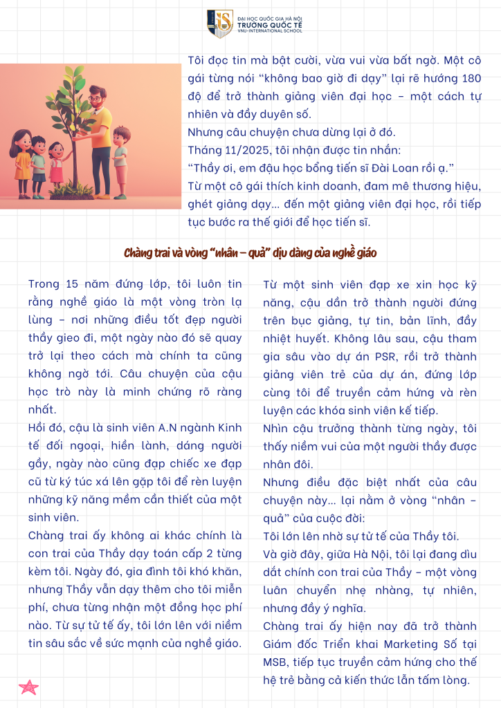 Trong nghề giáo, những điều tốt đẹp ta gieo đi sẽ luôn quay trở lại theo những cách kỳ diệu nhất. Vòng “nhân – quả” ấy minh chứng rằng sự tử tế và tâm huyết của người thầy không bao giờ mất đi. “Giáo dục không chỉ là bài giảng, mà là sự nâng đỡ”.