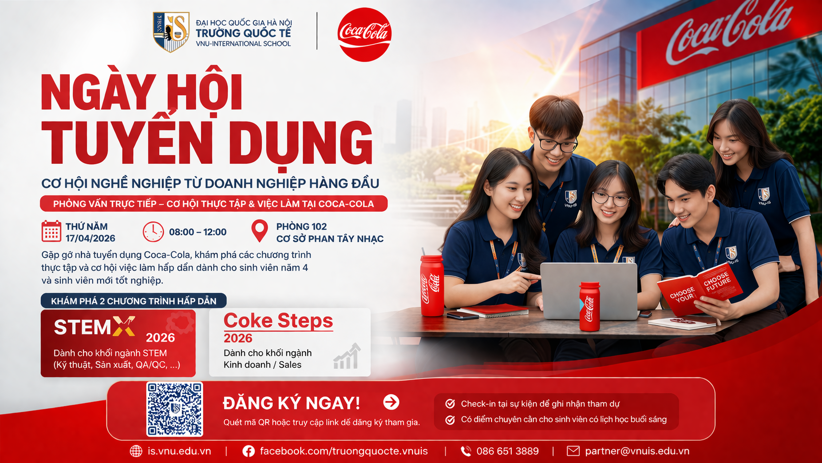 Trường Quốc tế – Đại học Quốc gia Hà Nội phối hợp cùng Swire Coca-Cola Việt Nam tổ chức Ngày hội tuyển dụng trực tiếp tại Trường, mang đến cơ hội để sinh viên gặp gỡ nhà tuyển dụng, tìm hiểu chương trình thực tập và tham gia phỏng vấn ngay tại chỗ.