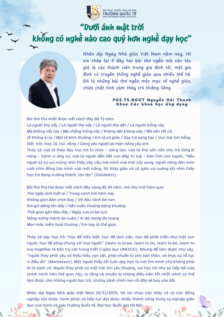 Một cái cây lớn thường khởi đầu bằng những mầm nhỏ, cuộc đời mỗi người không có thầy, cô sẽ không thể trưởng thành. Những người thầy, cô truyền cảm hứng cho các thế hệ, thắp lên những ngọn lửa đam mê cho các lớp sinh viên dẫn dắt đến những chặng đường thành công.