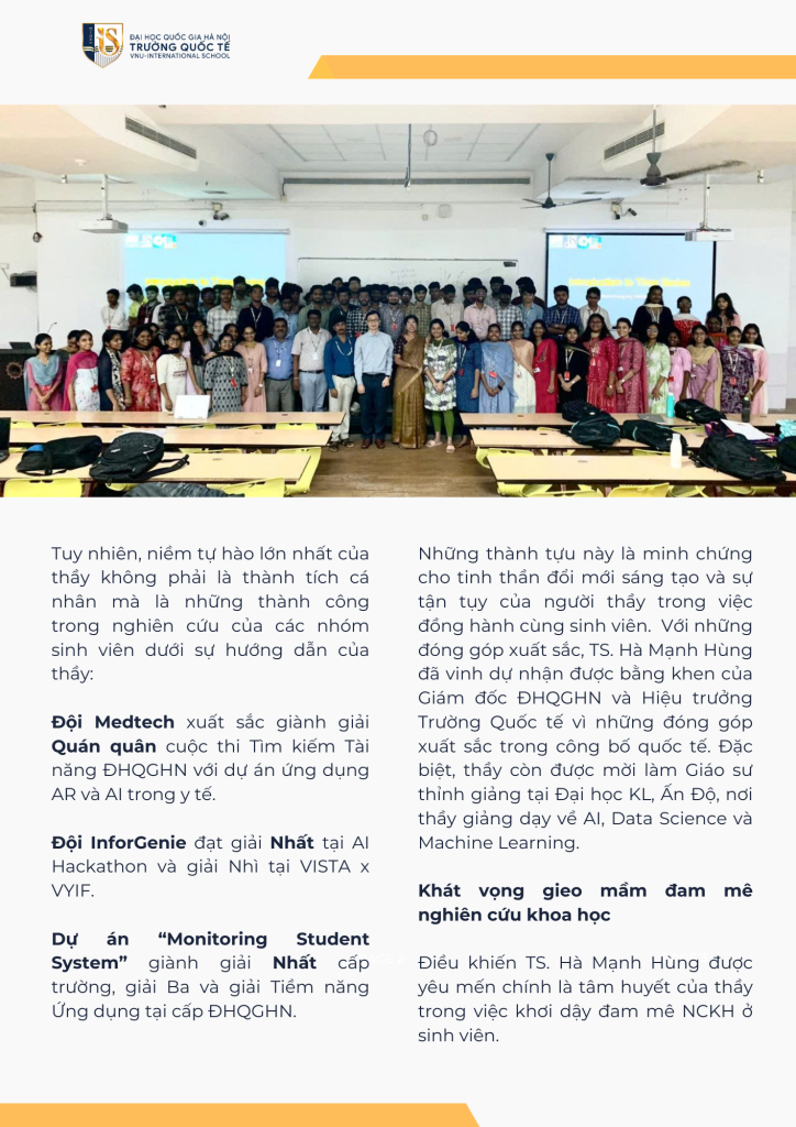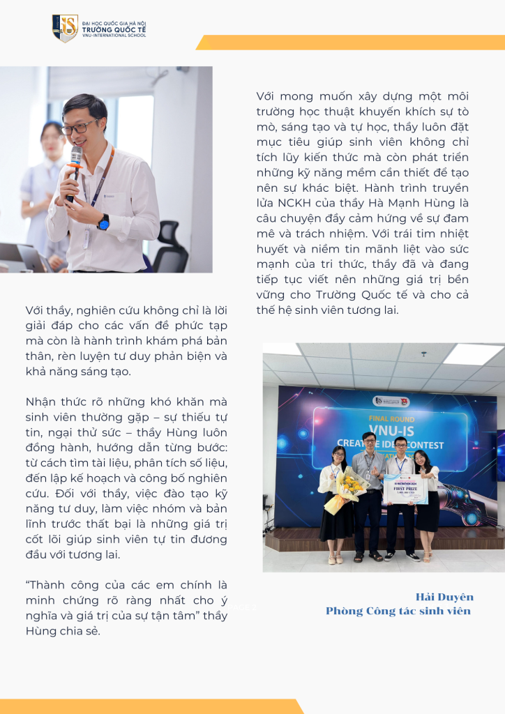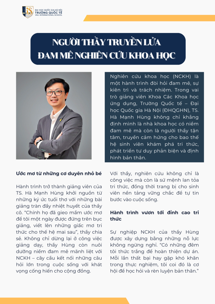 Nghiên cứu khoa học là một hành trình đòi hỏi đam mê, sự kiên trì và trách nhiệm. Trong vai trò giảng viên Khoa Các Khoa học ứng dụng, Trường Quốc tế – Đại học Quốc gia Hà Nội (ĐHQGHN), TS. Hà Mạnh Hùng không chỉ khẳng định mình là nhà khoa học có niềm đam mê mà còn là người thầy tận tâm, truyền cảm hứng cho bao thế hệ sinh viên khám phá tri thức, phát triển tư duy phản biện và định hình bản thân.
