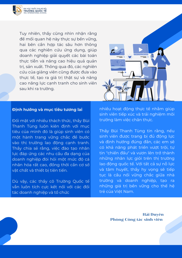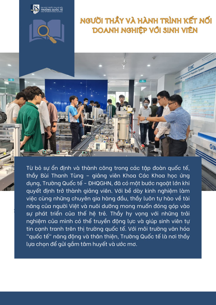 Từ bỏ sự ổn định và thành công trong các tập đoàn quốc tế, thầy Bùi Thanh Tùng – giảng viên Khoa Các Khoa học ứng dụng, Trường Quốc tế – Đai học Quốc gia Hà Nội (ĐHQGHN) đã có một bước ngoặt lớn khi quyết định trở thành giảng viên. Với bề dày kinh nghiệm làm việc cùng những chuyên gia hàng đầu, thầy luôn tự hào về tài năng của người Việt và nuôi dưỡng mong muốn đóng góp vào sự phát triển của thế hệ trẻ.