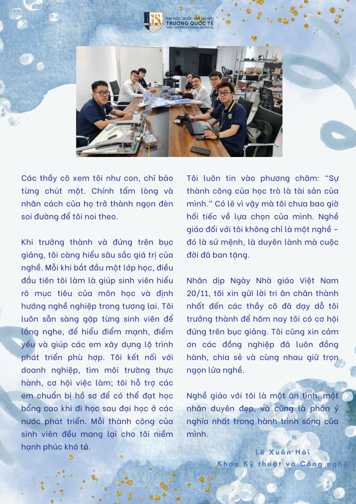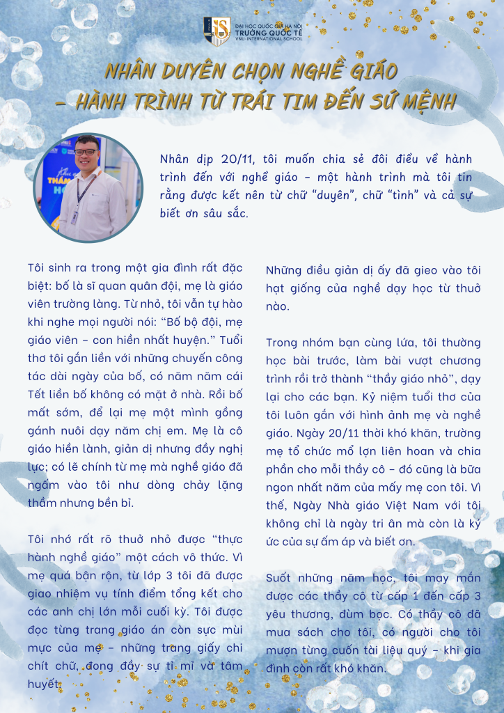 Tôi luôn tin vào phương châm: “Sự thành công của học trò là tài sản của mình.” Có lẽ vì vậy mà tôi chưa bao giờ hối tiếc về lựa chọn của mình. Nghề giáo đối với tôi không chỉ là một nghề – đó là sứ mệnh, là duyên lành mà cuộc đời đã ban tặng.