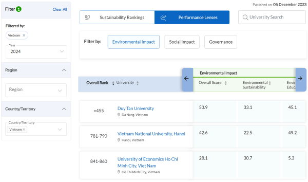 Ngày 05/12/2023, tổ chức xếp hạng QS đã công bố kết quả xếp hạng QS World University Rankings: Sustainability 2024 cho 1.403 cơ sở giáo dục đại học trên toàn thế giới.
