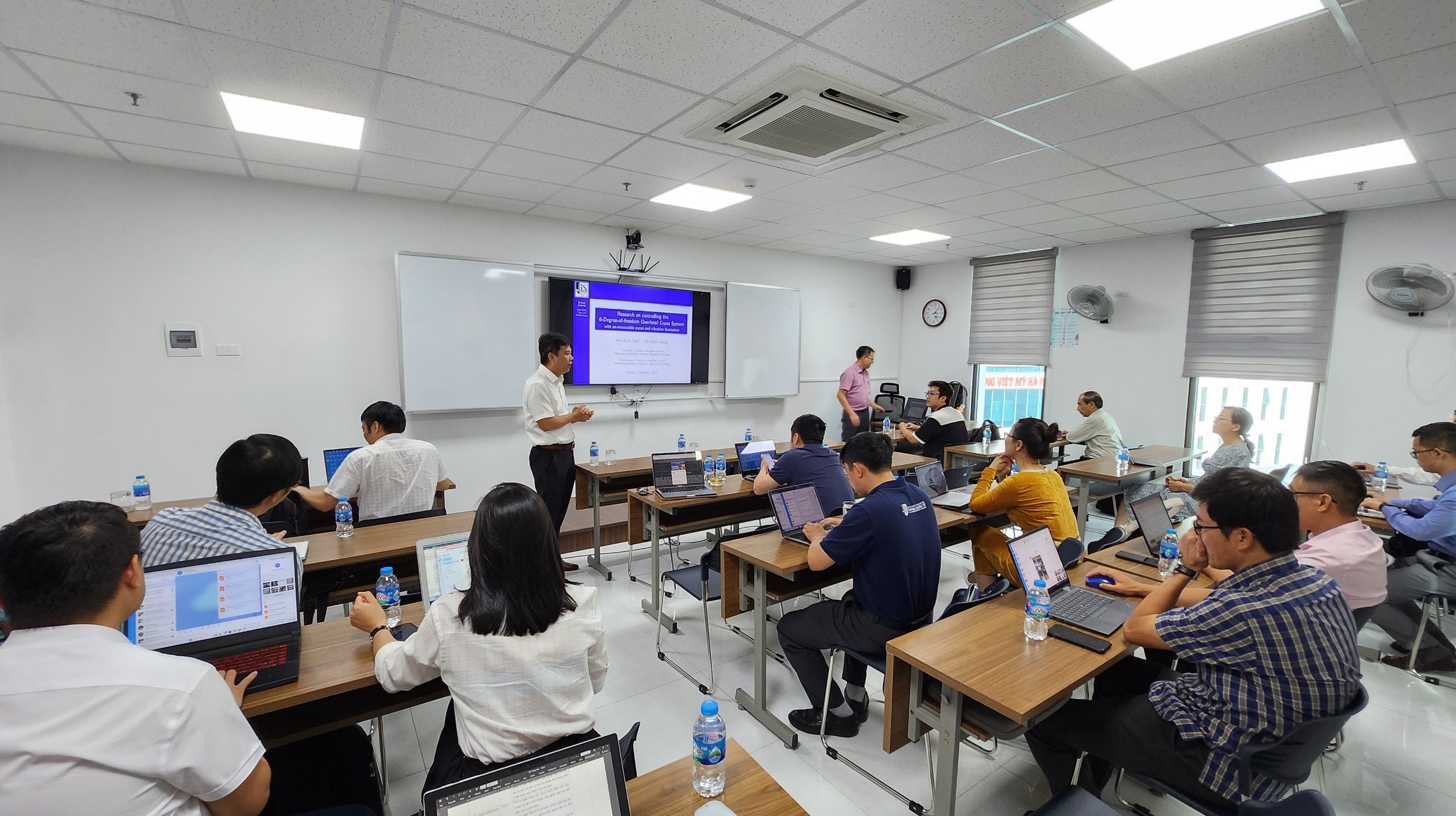 Vào lúc 15h00 ngày 10/10/2023, Khoa Các khoa học ứng dụng (CKHUD), Trường Quốc tế, ĐHQGHN đã tổ chức một buổi seminar với chủ đề “Nghiên cứu thiết kế bộ điều khiển cho hệ cần cẩu 3D 6 bậc tự do”. Buổi seminar do TS. Kim Đình Thái và Đỗ Mạnh Dũng trình bày với sự tham gia đông đảo của toàn thể cán bộ, giảng viên và nghiên cứu sinh của Khoa. Đặc biệt, tới dự seminar còn có GS. TSKH Hồ Tú Bảo và TS. Trần Đức Quỳnh – Trưởng phòng đào tạo của nhà trường.