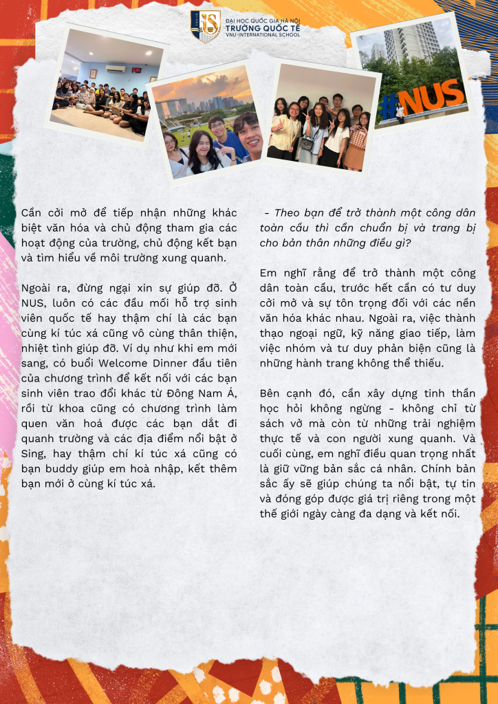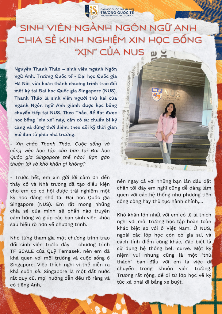 Nguyễn Thanh Thảo – sinh viên ngành Ngôn ngữ Anh, Trường Quốc tế – Đại học Quốc gia Hà Nội, vừa hoàn thành chương trình trao đổi một kỳ tại Đại học Quốc gia Singapore (NUS). Thanh Thảo là sinh viên người thứ hai của ngành Ngôn ngữ Anh giành được học bổng chuyển tiếp tại NUS. Theo Thảo, để đạt được học bổng “xịn xò” này, cần có sự chuẩn bị kỹ càng và đúng thời điểm, theo dõi kỹ thời gian mở đơn từ phía nhà trường.