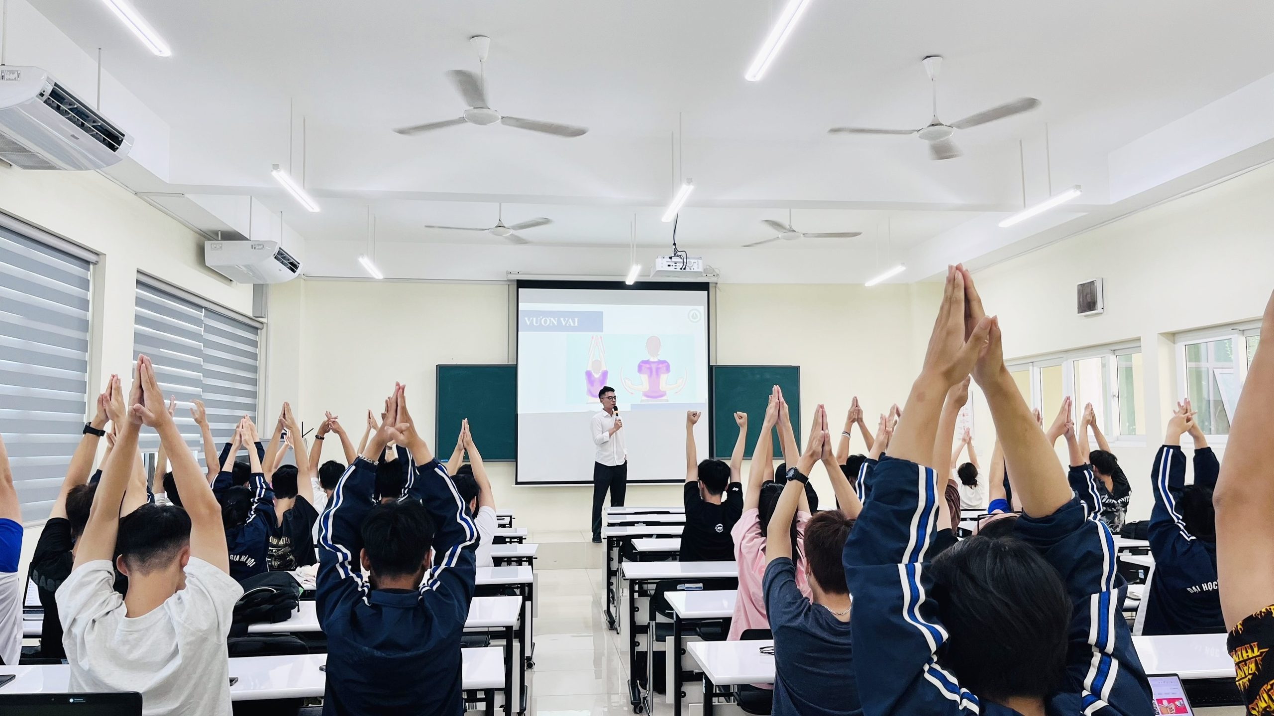 Sinh viên QH2023 tại Hòa Lạc thực hành bài tập giãn cơ vai – gáy.