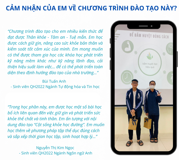 Qua các nội dung đào tạo của học phần, sinh viên có thể nhận thức được tầm quan trọng của thói quen sinh hoạt lành mạnh, khoa học đối với sự phát triển hài hòa sức khỏe thể chất và tinh thần mỗi người; nắm được các phương pháp điều chỉnh, quản lý, cân bằng cảm xúc cá nhân để tiến đến hình thành phong cách sống tích cực, cân bằng hài hòa cảm xúc, giữ cho Thân khỏe, Tâm an, Trí sáng. Hơn nữa, các kiến thức chăm sóc sức khỏe chủ động của chương trình còn giúp các em luôn khỏe mạnh, tràn đầy năng lượng để học tập, sáng tạo và khẳng định bản thân.