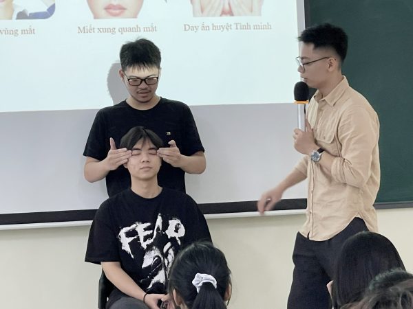 Sinh viên QH2023 thực hành bài tập xoa bóp, bấm huyệt chữa đau đầu.