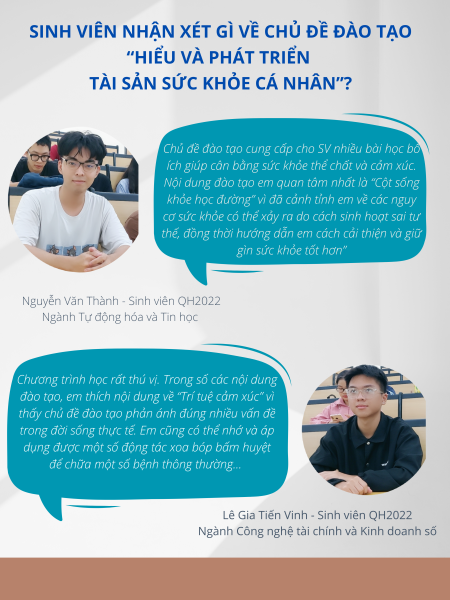 Trong năm học 2023-2024 và năm học 2024-2025, chủ đề đào tạo “Hiểu và phát triển tài sản sức khỏe cá nhân” thuộc học phần kỹ năng bổ trợ ISV1020 được đưa vào giảng dạy cho 2.335 sinh viên QH2022 và QH2023 của Trường Quốc tế – Đại học Quốc gia Hà Nội. Như tên gọi, chủ đề đào tạo “Hiểu và phát triển tài sản sức khỏe cá nhân” là chương trình được thiết kế nhằm mục đích cung cấp cho sinh viên kiến thức, hiểu biết về chính cơ thể mình và mối quan hệ với môi trường tự nhiên xung quanh.