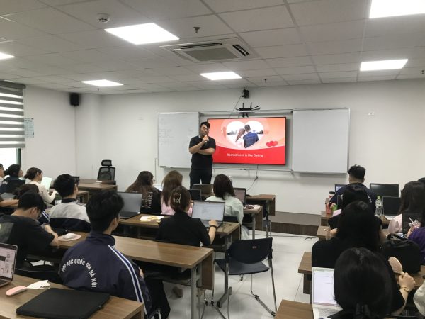 Ông cũng chia sẻ về vấn đề tuyển dụng nhân sự trong doanh nghiệp, việc tuyển dụng giống như việc hẹn hò, việc đầu tiên là chúng ta phải yêu thích ứng viên đó, vì khi đã tuyển dụng nhân sự đó, bạn sẽ phải làm việc và gắn bó với họ trong thời gian dài… Đồng thời, trong một thời đại mà sự phụ thuộc và liên kết giữa các tổ chức, cá nhân ngày càng trở nên chặt chẽ, ông khuyến nghị sinh viên cần tăng cường mở rộng mạng lưới mối quan hệ để có thể hỗ trợ cho công việc và sự nghiệp kinh doanh của các bạn trong tương lai. Ông cũng lưu ý sinh viên về việc sử dụng mạng xã hội, tất cả các bài p chia sẻ của chúng ta trên mạng xã hội là nguồn thông tin quan trọng mà các nhà tuyển dụng sử dụng để đánh giá về ứng viên. Ông cũng nhấn mạnh thêm về thị trường lao động ở Việt Nam, Đài Loan (Trung Quốc) và quốc tế hiện nay đòi hỏi sinh viên phải chuẩn bị những kỹ năng mềm, đồng thời ông cũng nhấn mạnh tầm quan trọng của các ngôn ngữ như tiếng Anh, tiếng Trung, tiếng Hàn, tiếng Nhật …. sẽ giúp sinh viên có nhiều cơ hội việc làm với mức lương hấp dẫn vì rất nhiều doanh nghiệp Đài Loan (Trung Quốc), Hàn Quốc, Nhật Bản đang mở rộng đầu tư tại Việt Nam.