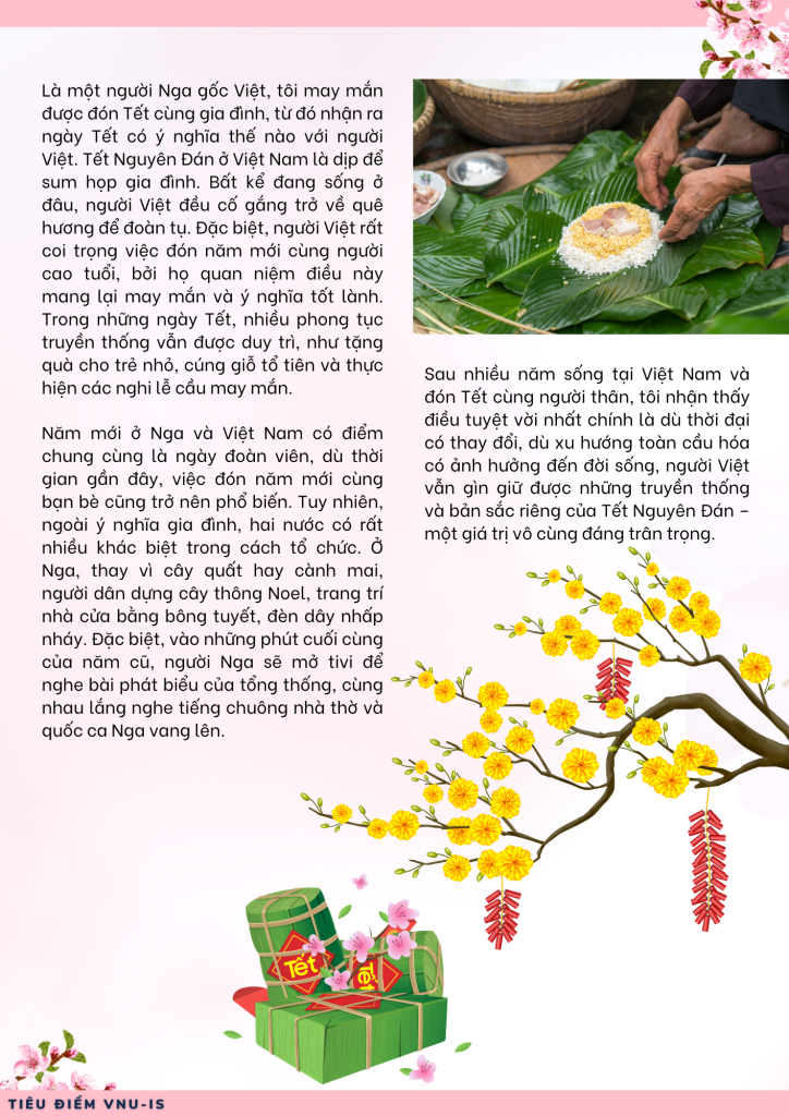 Sau nhiều năm sống tại Việt Nam và đón Tết cùng người thân, tôi nhận thấy điều tuyệt vời nhất chính là dù thời đại có thay đổi, dù xu hướng toàn cầu hóa có ảnh hưởng đến đời sống, người Việt vẫn gìn giữ được những truyền thống và bản sắc riêng của Tết Nguyên Đán – một giá trị vô cùng đáng trân trọng.