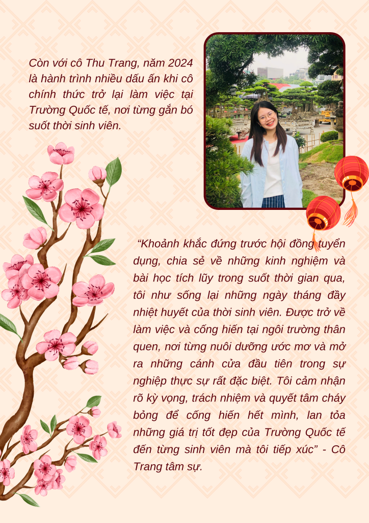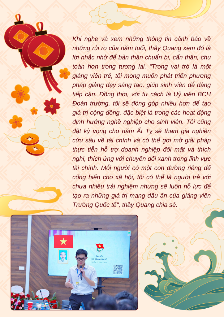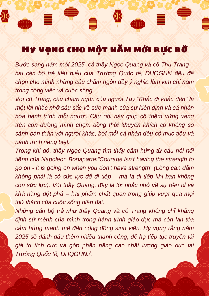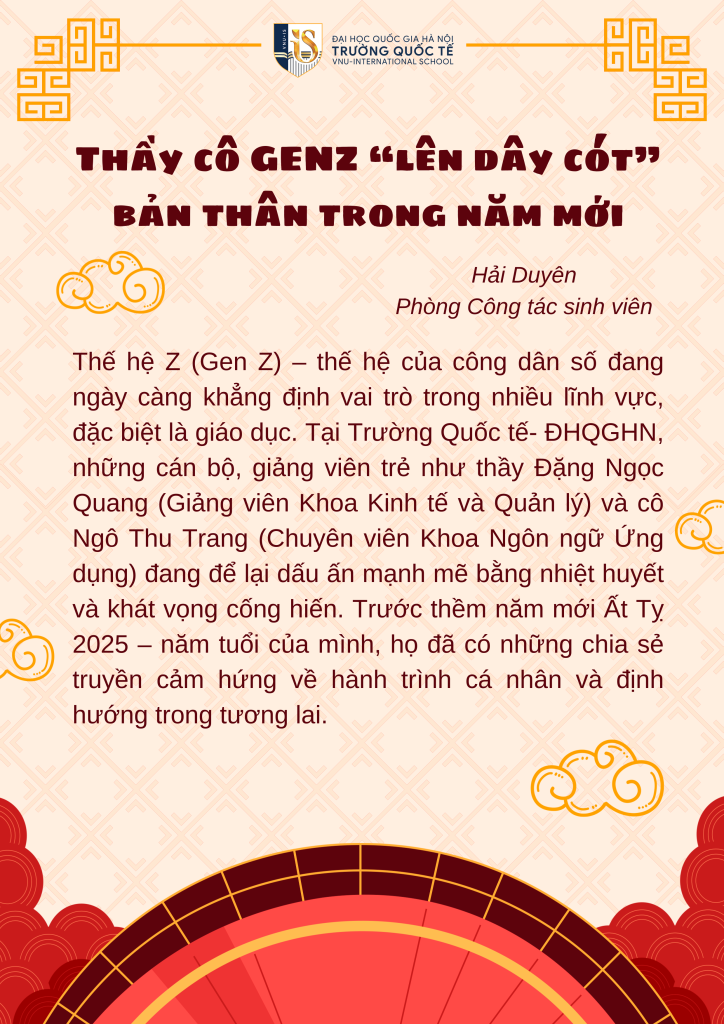 Thế hệ Z (Gen Z) – thế hệ của công dân số đang ngày càng khẳng định vai trò trong nhiều lĩnh vực, đặc biệt là giáo dục. Tại Trường Quốc tế, ĐHQGHN, những cán bộ, giảng viên trẻ như thầy Đặng Ngọc Quang (Giảng viên Khoa Kinh tế và Quản lý) và cô Ngô Thu Trang (Chuyên viên Khoa Ngôn ngữ Ứng dụng) đang để lại dấu ấn mạnh mẽ bằng nhiệt huyết và khát vọng cống hiến. Trước thềm năm mới Ất Tỵ 2025 – năm tuổi của mình, họ đã có những chia sẻ truyền cảm hứng về hành trình cá nhân và định hướng trong tương lai.